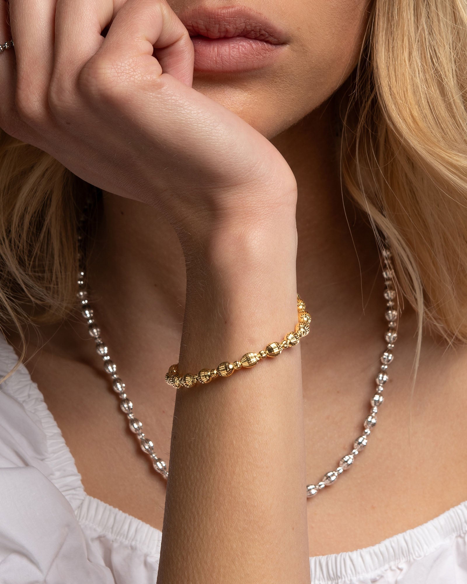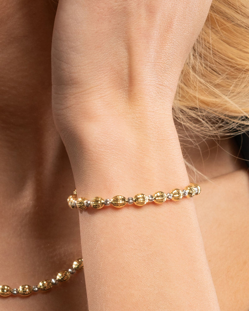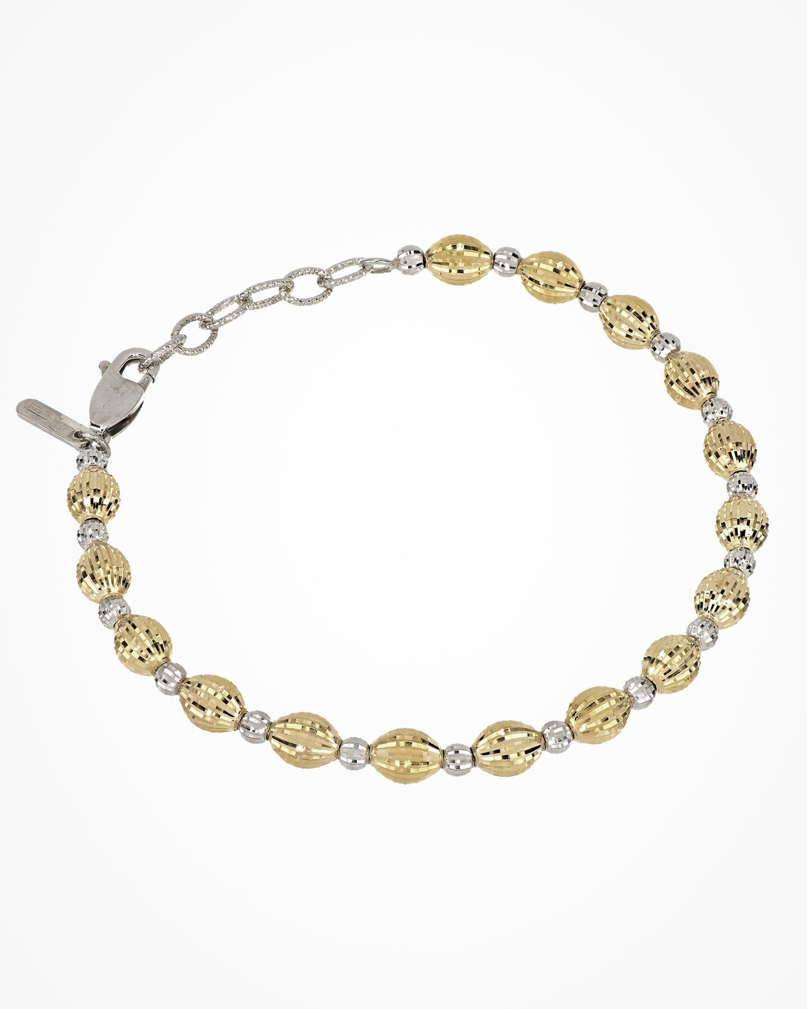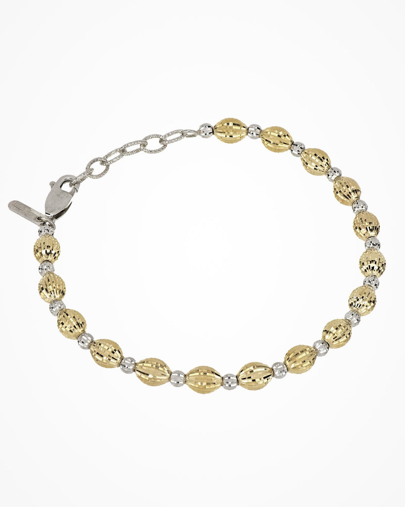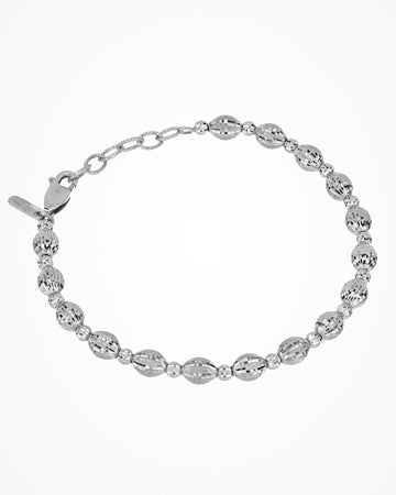 Silver bracelet with hand-assembled oval and round beads. The two diamond-cut elements have different shape in oder to create a dynamic shiny effect.