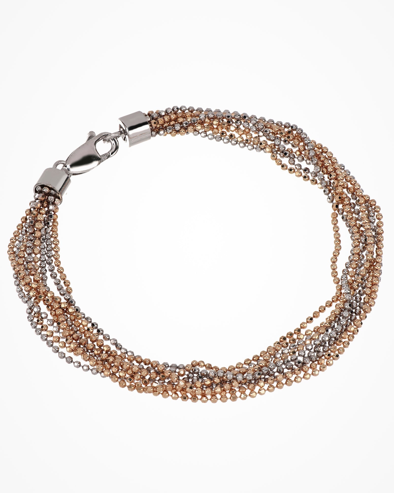 Multi-strand silver bracelet with small bicolor elements for a shiny elegant effect.