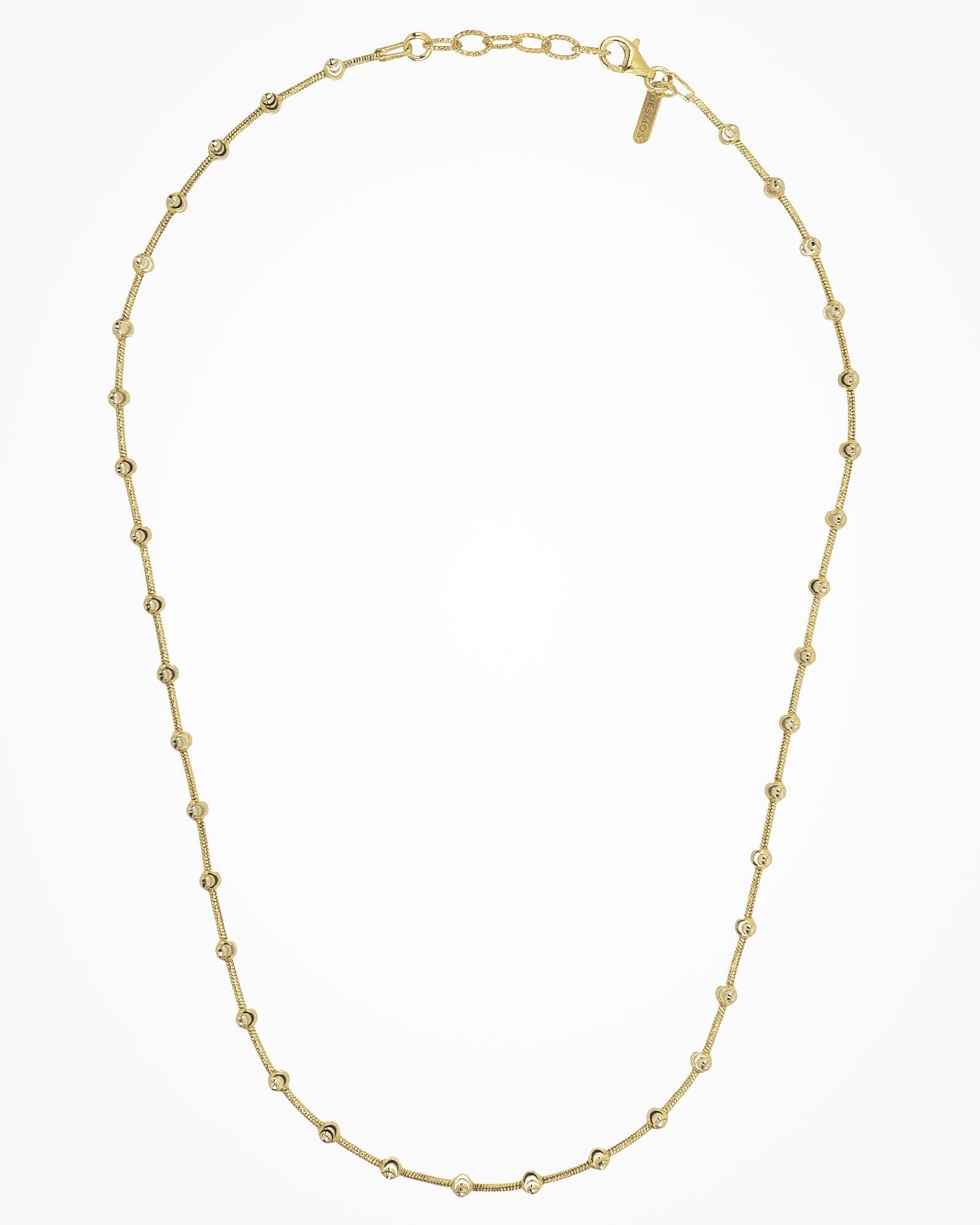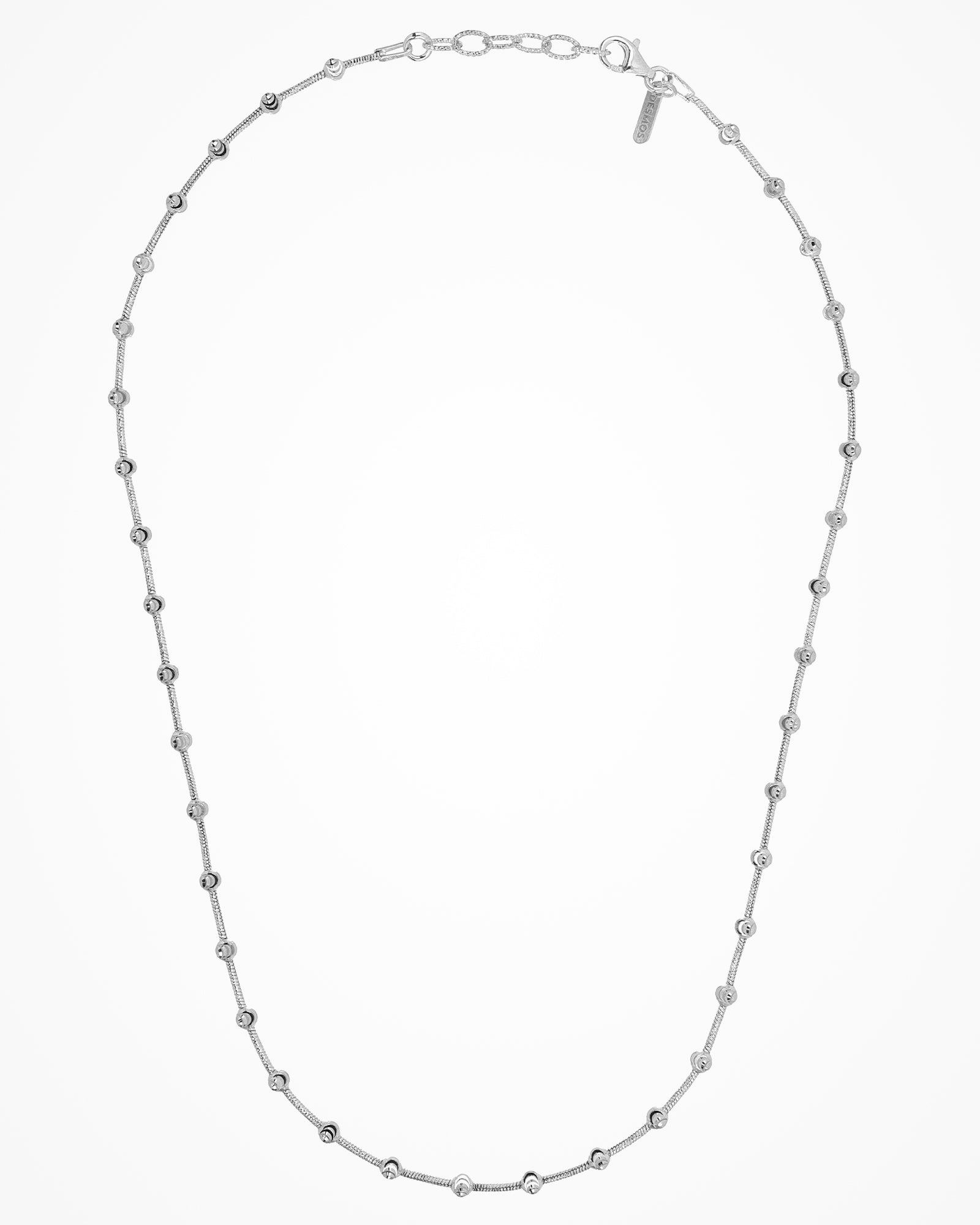 Silver necklace with a slim chain and round shiny diamond-cut elements.