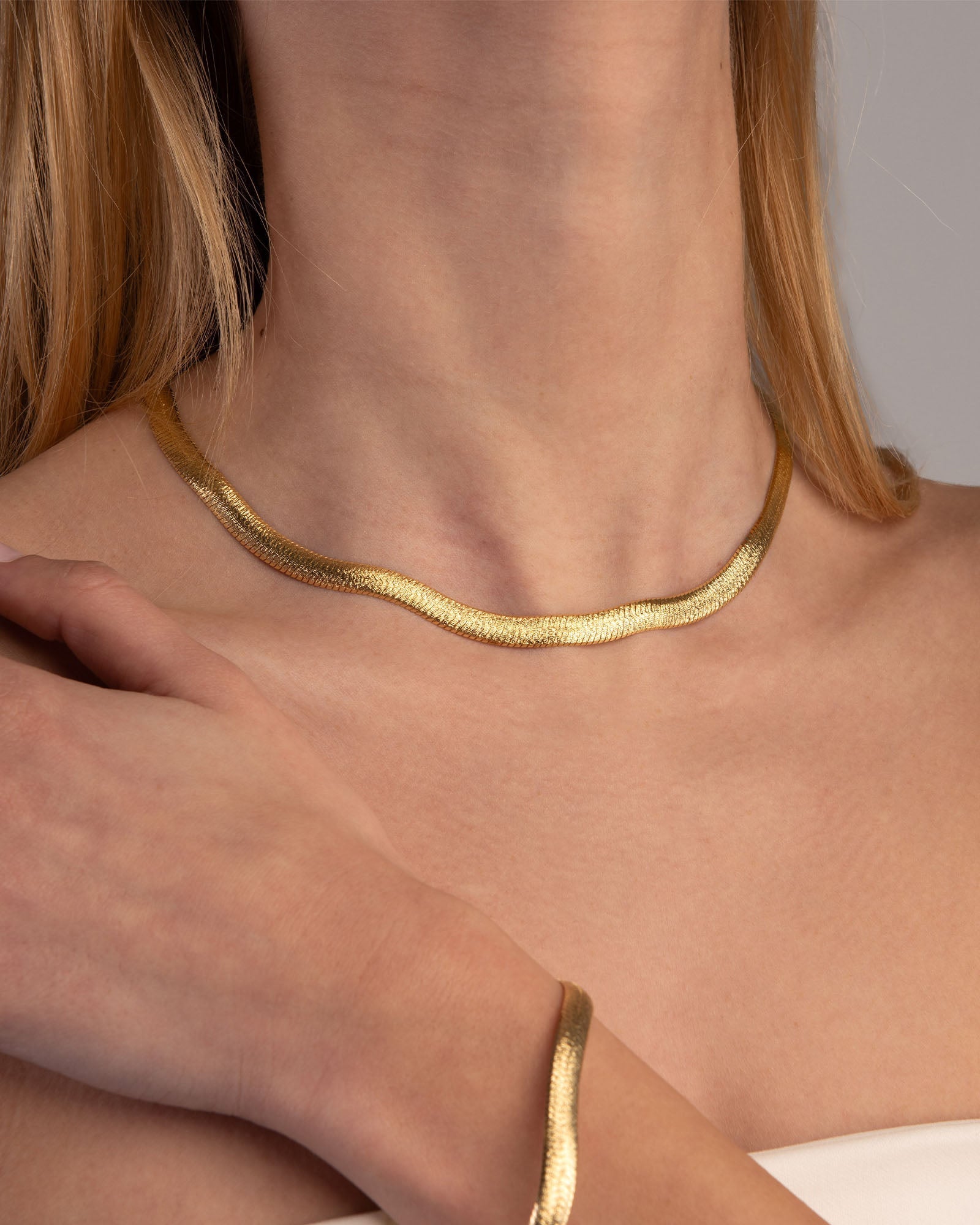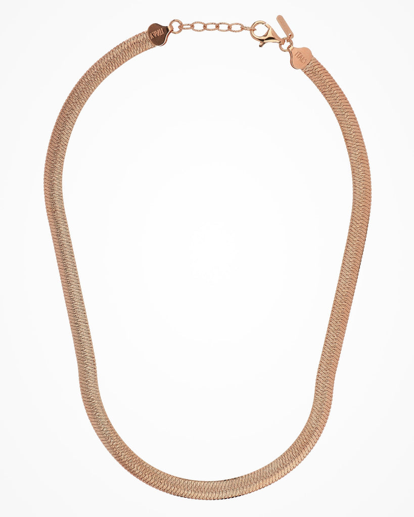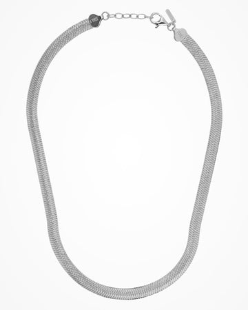 Silver necklace with large flat sinuous chain and decorated with a shiny thin pattern along the whole surface.