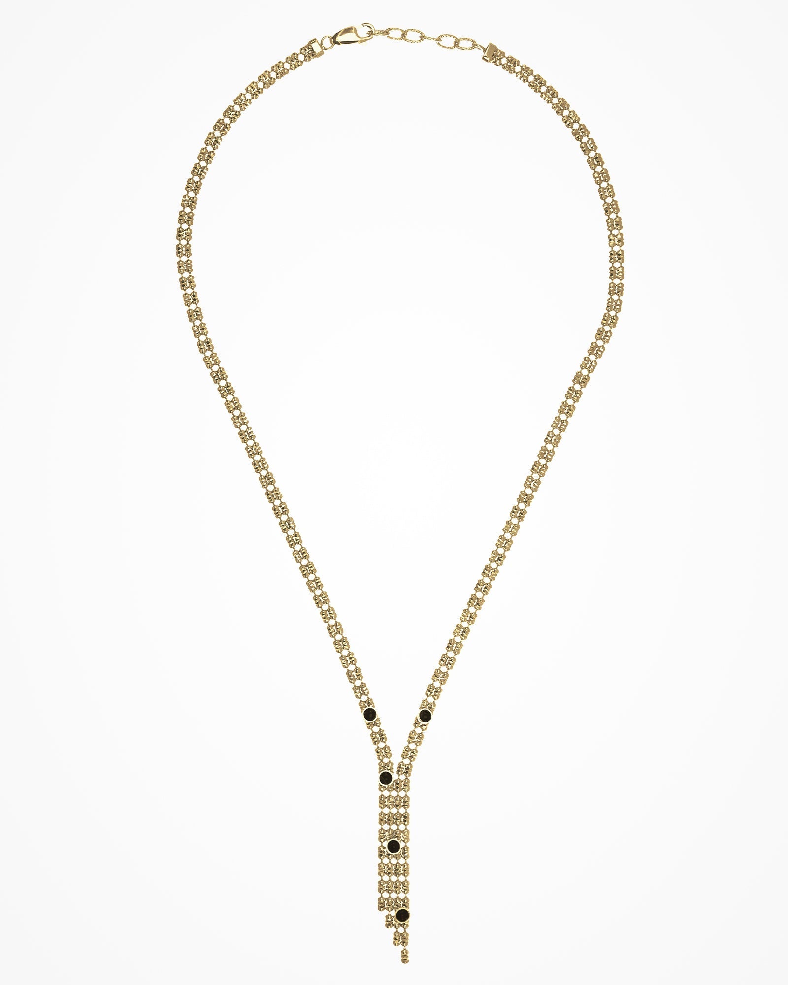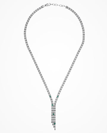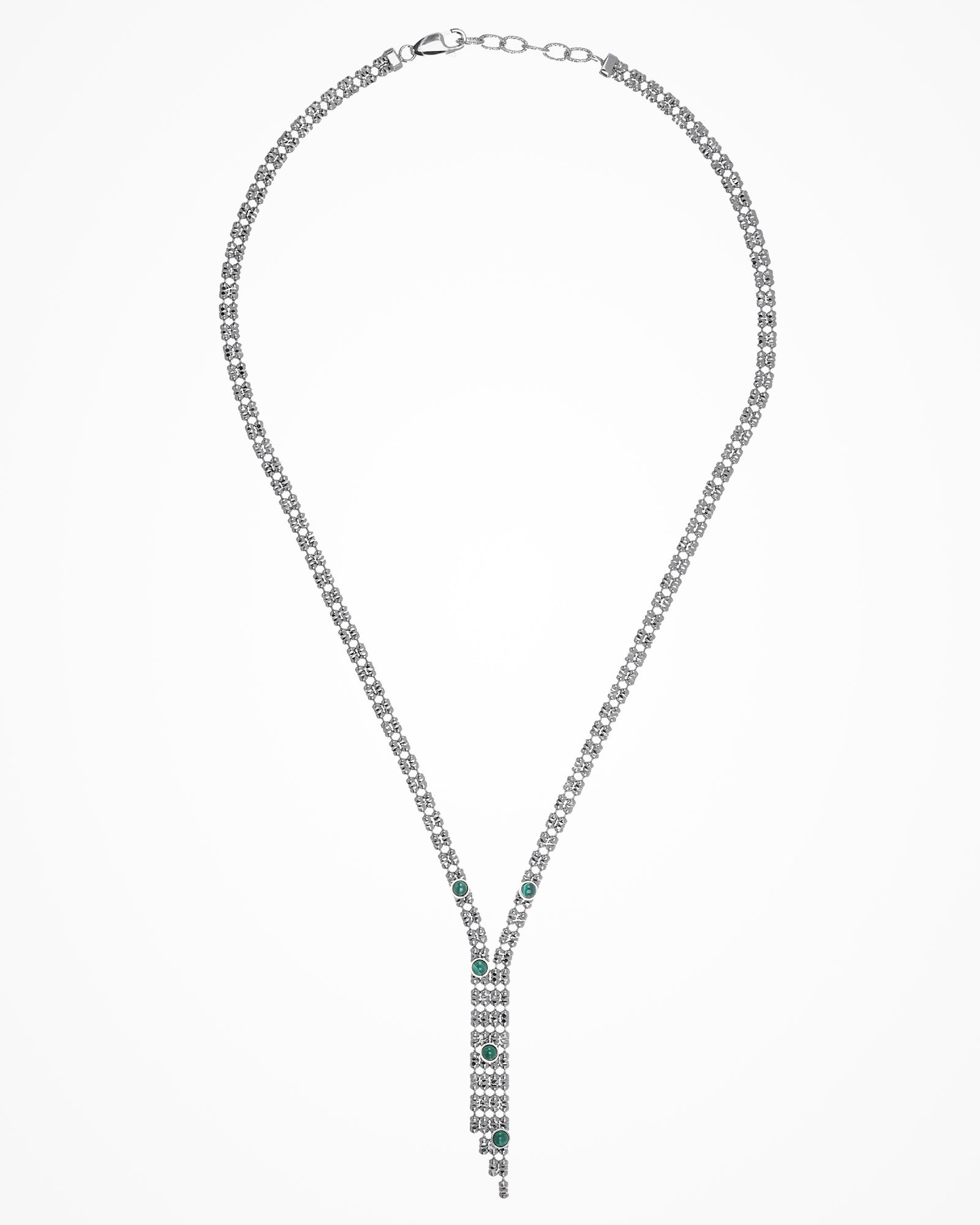 Multi-strand silver Y-shaped necklace made of tiny silver beads and small natural stones cabochon. The diamond-cut element provide a longlasting shine.