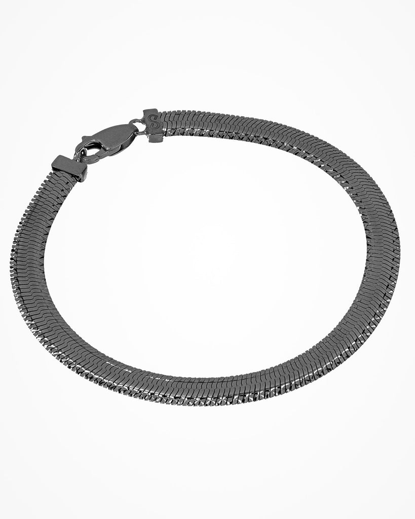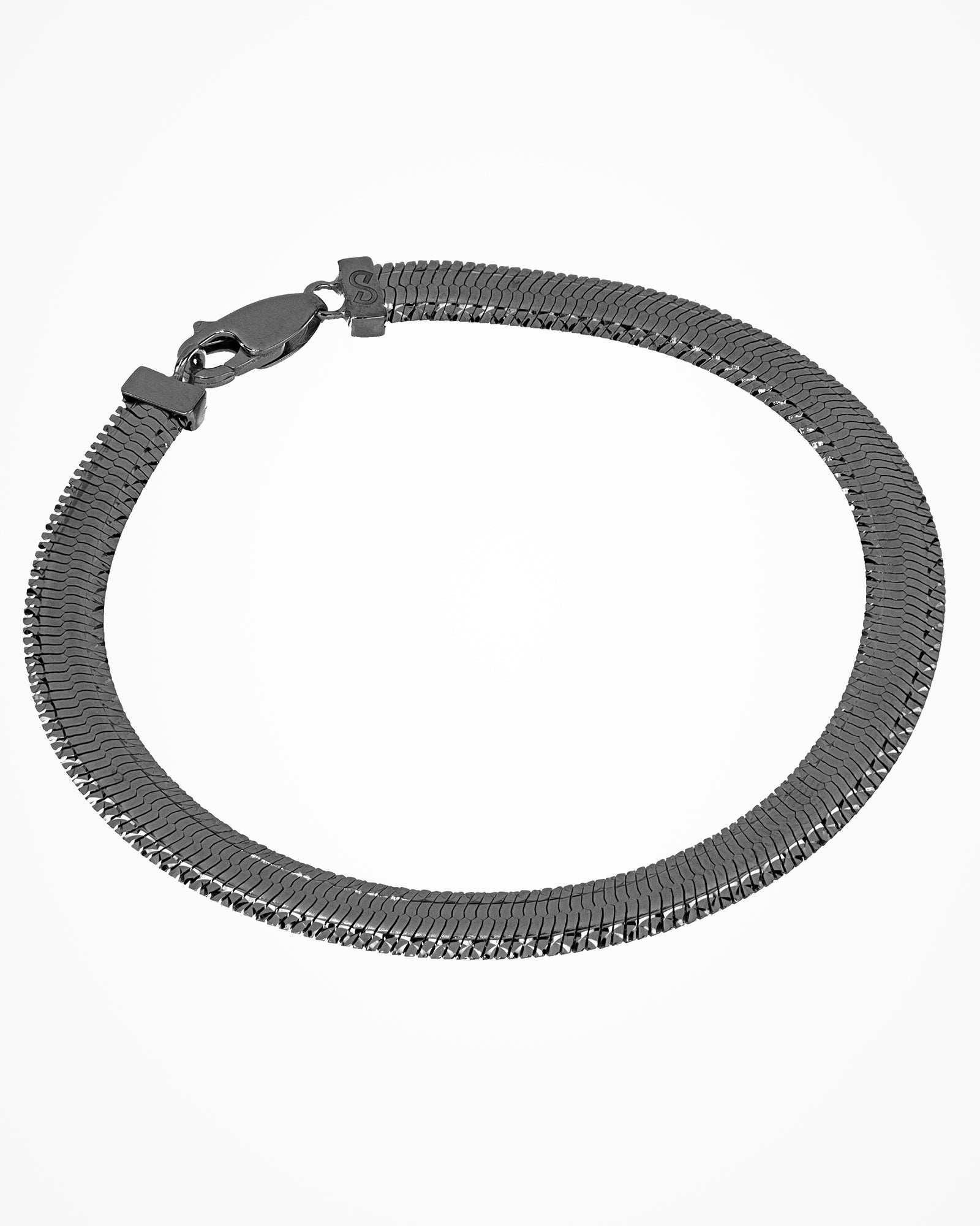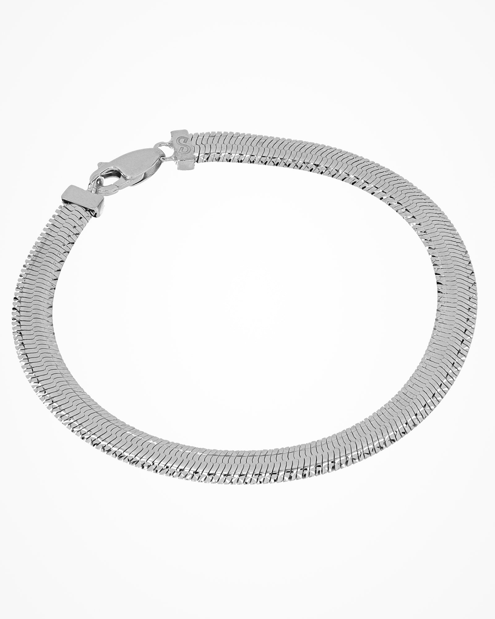 Silver bracelet with flat sinuous chain and contrasting shiny pattern.